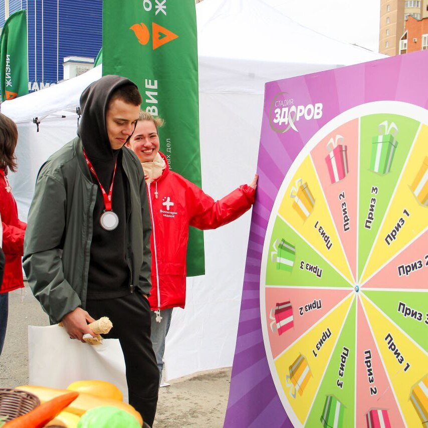 Проект «Стадия: ЗДОРОВ» подготовил для гостей интерактив «Колесо фортуны» с полезными призами. Его участниками стали более 110 человек. Также на празднике волонтеры рассказывали о донорстве костного мозга и здоровом образе жизни. А 35 участников сдали образец крови и подали заявление на вступление в Федеральный регистр доноров.